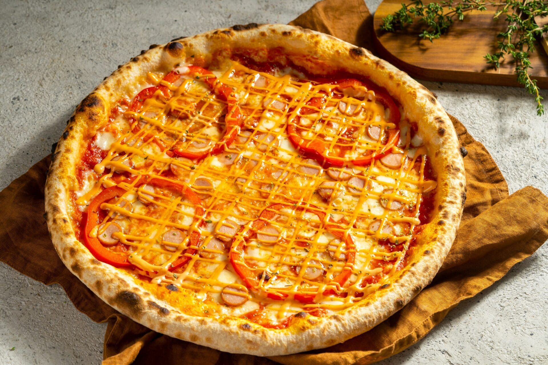 Тесто основа, соус томатный, сыр моцарелла, сосиски, бекон, болгарский перец, соус розовый, орегано.