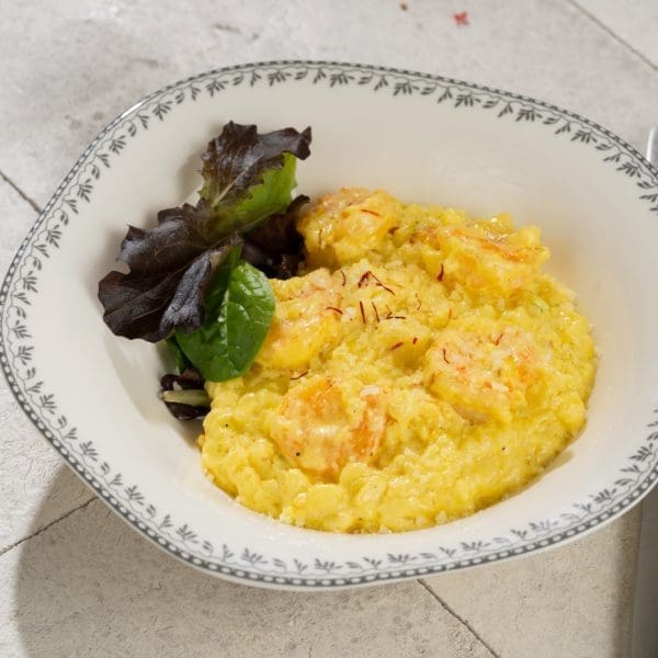 Arborio riis, rõõsk koor, parmesani juust, safran, krevetid, sibul, küüslauk, valge vein, kalapuljong, sellerivars, sool, pipar, maitseroheline