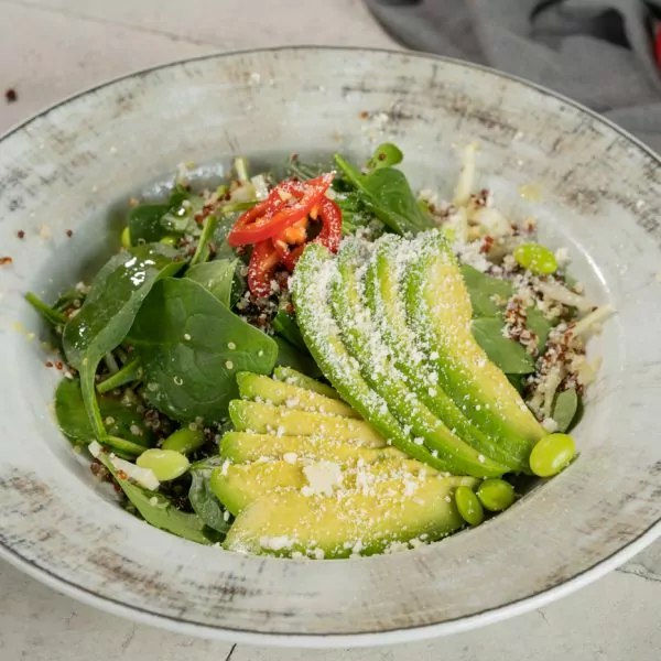 Spinat, fenkol, kinoa, avokaado, edamame oad, parmesani juust, tšillipipar, ingveri-meekaste