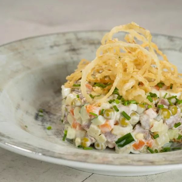 Kartul, veiseliha, porgand, marineeritud kurgid, kanamuna, rohelised herned, majonees, praetud sibul, vutimuna